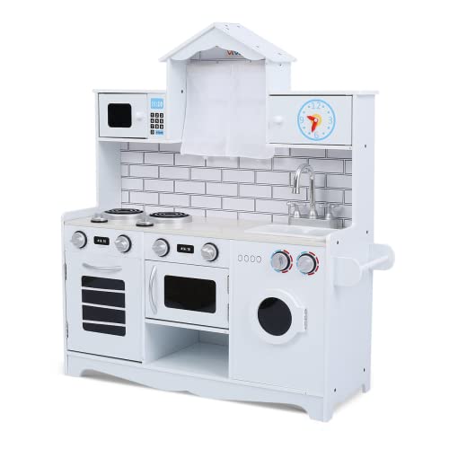Baby Vivo Kinderküche Spielküche mit Vorhängen Fenster Mikrowelle Waschmaschine aus Holz Kinderspielküche Küche Holzküche Spielzeugküche – Maya mit Vorhängen in Weiß