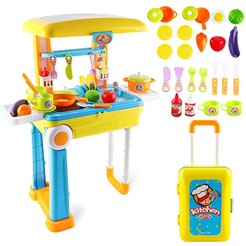 deAO SC-KB 2-in-1 Tragbares ‚My Little Chef‘ Küchenset Koffer Spielset mit Sound, Licht und Zubehör enthalten (gelb), 3-5 Jahre